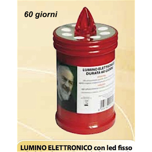 Lumino votivo elettronico a led fisso acceso rosso con immagine Padre Pio, durata di 60 giorni, garantisce un ottimo risultato durante il tempo indicato. Involucro in plastica rigida.