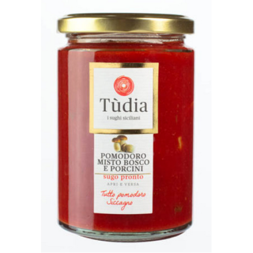 Il sugo al pomodoro con misto di funghi porcini in olio extra vergine di oliva, è una specialità che coniuga il gusto delle montagne siciliane, Madonite, con la fragranza della campagna accarezzata dalla brezza marina. I funghi misti e i funghi porcini insieme, danno il piacere dei boschi montani, completato con i pomodori siccagni siciliani (tipo di pomodori siciliani con molta polpa e poca acqua). Con formaggio grattuggiato parmigiano o pecorino, si crea una delle ricette siciliane più semplici e staordinarie.