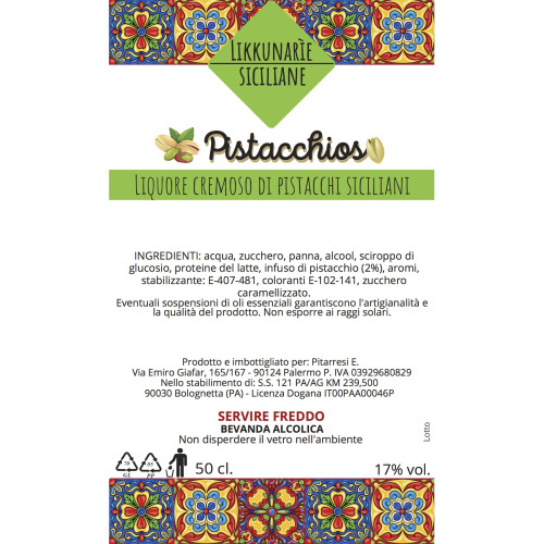 INGREDIENTI: acqua, zucchero, panna, alcool, sciroppo di glucosio, proteine del latte, infuso di pistacchio (2%), aromi. Stabilizzante : E-407-481 Coloranti : E-102-141, zucchero caramellizzato. Eventuali sospensioni di oli essenziali garantiscono l'artigianalità e la qualità del prodotto. Non esporre ai raggi solari.