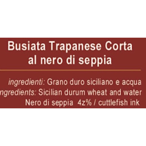 Busiate trapanesi corte al nero di seppia, artigianali, con solo grano 100% siciliano, coltivato e prodotti in Sicilia. L'aggiunta del nero di seppia all'impasto delle busiate, in quantità del 4%, ne determina l'eccellenza di un gusto unico mediterraneo, e l'unicità della qualità indiscussa degli ingredienti utilizzati.