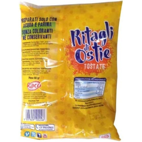 Ritagli di ostie tostati e croccanti, ottimi come snack sani in pausa caffè, al posto degli snack fritti e grassi, e come spezzafame in ufficio e a casa. Ideali per i bambini, essendo composti semplicemente da acqua e farina 00, tostati e non fritti, senza sale o conservanti.Ogni busta contiene 60 grammi di ritagli, frutto della produzione delle ostie e particole, parti laterali in eccesso del foglio utilizzato per il taglio delle ostie, tostate per conseguire una maggiore consistenza. Leggerissimi e non pesanti, sono adatti anche alla preparazione di dolciumi vari, come per esempio i torroni o varianti di esso, farcite con il miele o per favorire, all'occorenza, la deglutizione di compresse da parte di anziani o soggetti sensibili, semplicemente inserendo le pillole nel mezzo di due pezzetti di ritagli di ostia.